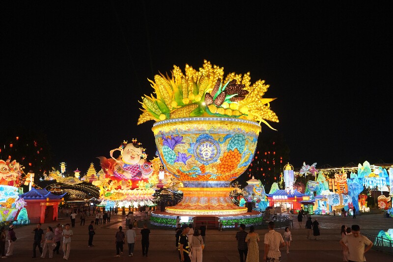 《五谷丰登》是本届灯会迎春贺年主题区核心地标,高 20 米,以 “五谷丰登,国泰民安” 的千年家国祈愿为内核,是游客入园核心打卡点。灯组以掐丝珐琅风格打造巨型宝碗主体,核心视觉耗用 60 万个玻璃药瓶手工捆扎成饱满五谷穗束,辅以万余件瓷器非遗捆扎工艺装饰,既延续自贡彩灯 “万物皆可成灯” 的创作精髓、践行绿色环保理念,更以鲜活丰收意象致敬劳动之美,礼赞盛世图景。