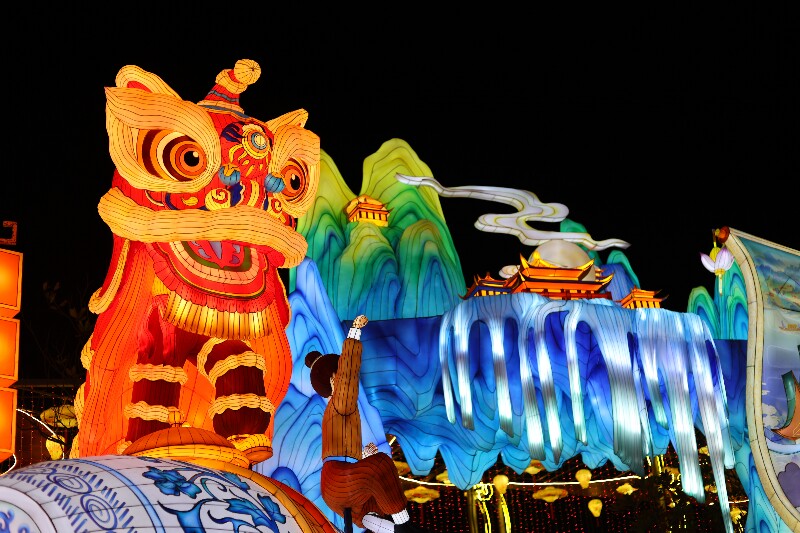 《四海升平》与《五谷丰登》遥相呼应,共同构建 “国泰民安” 核心叙事。灯组以 “海晏河清,四海升平” 为创作内核,深挖明清官窑彩瓷文化精髓,以粉彩、斗彩、珐琅彩为创作蓝本,打造祥龙、醒狮、山河图景等标志性视觉符号。作品坚守自贡彩灯丝架造型、分色裱糊、内打光的核心非遗技艺,搭配现代光影渲染技术,让静态瓷绘纹样实现动态流转,让传统瓷文化在光影中焕发新生,是彰显东方美学的标杆之作。