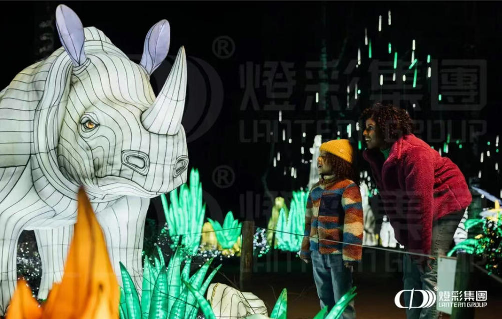 本届彩灯节以“穿越时空的旅程”为主题,在动物园内打造了15个特色区域,串联起地球演化与人类文明的壮阔历程。从地球初现的混沌光影,到海洋生命的灵动闪烁;从恐龙时代的巨兽雄姿,到哺乳动物的繁衍生机;从农业革命的火种,到古代文明的辉煌,再到文艺复兴的光芒与未来的奇幻——近80组灯组,把亿万年间的故事讲得生动鲜活。
