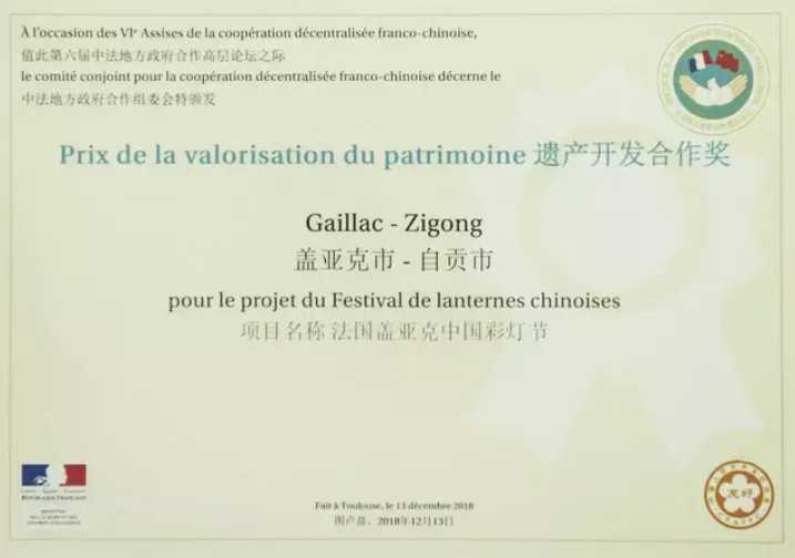 自贡市与法国盖亚克市是友好城市关系。自2017年至今,由自贡灯彩集团承办的“中国彩灯节”已连续三年在法国盖亚克成功举办。2018年,“盖亚克中国彩灯节”荣获中国人民对外友好协会和法国外交部颁发的地方政府“遗产开发合作奖”。灯彩集团董事局主席黄德春荣获法国盖亚克荣誉市民及盖亚克世界葡萄酒大使称号。